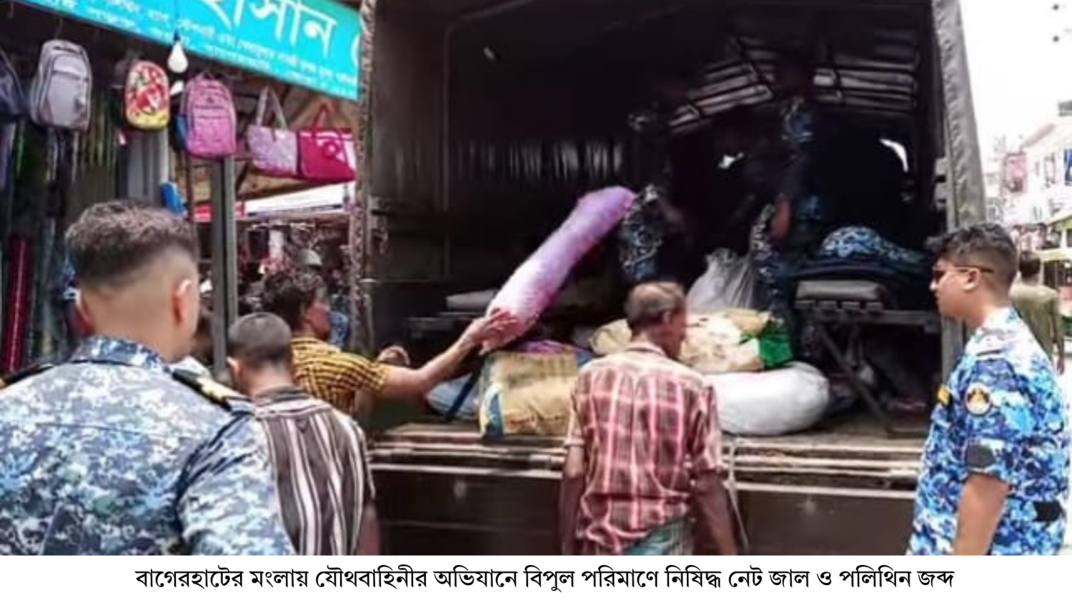 রায়হান শেখ, বাগেরহাট প্রতিনিধিঃ মোংলায় পরিবেশ অধিদপ্তর ও উপজেলা প্রশাসন, কোষ্টগার্ডের যৌথ অভিযানে বিপুল পরিমাণ নিষিদ্ধ নেট জাল ও পলিথিন