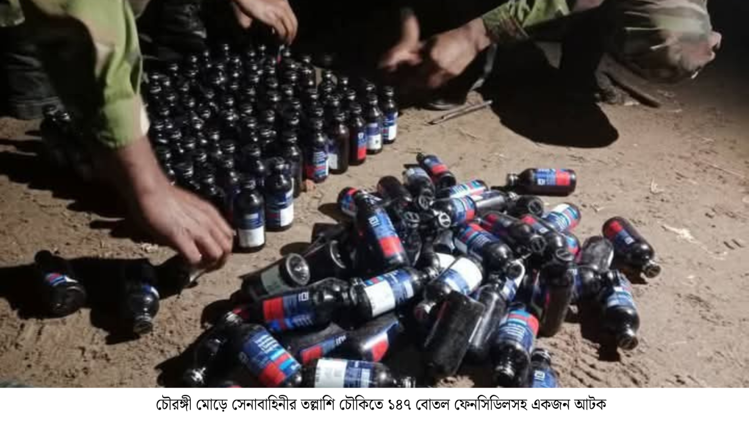 মোঃ রাইয়ান, নীলফামারীঃ নীলফামারীর চৌরঙ্গী মোড় এলাকায় সেনাবাহিনীর একটি অস্থায়ী তল্লাশি চৌকিতে অভিযান চালিয়ে ১৪৭ বোতল ফেনসিডিলসহ একজনকে আটক করেছে