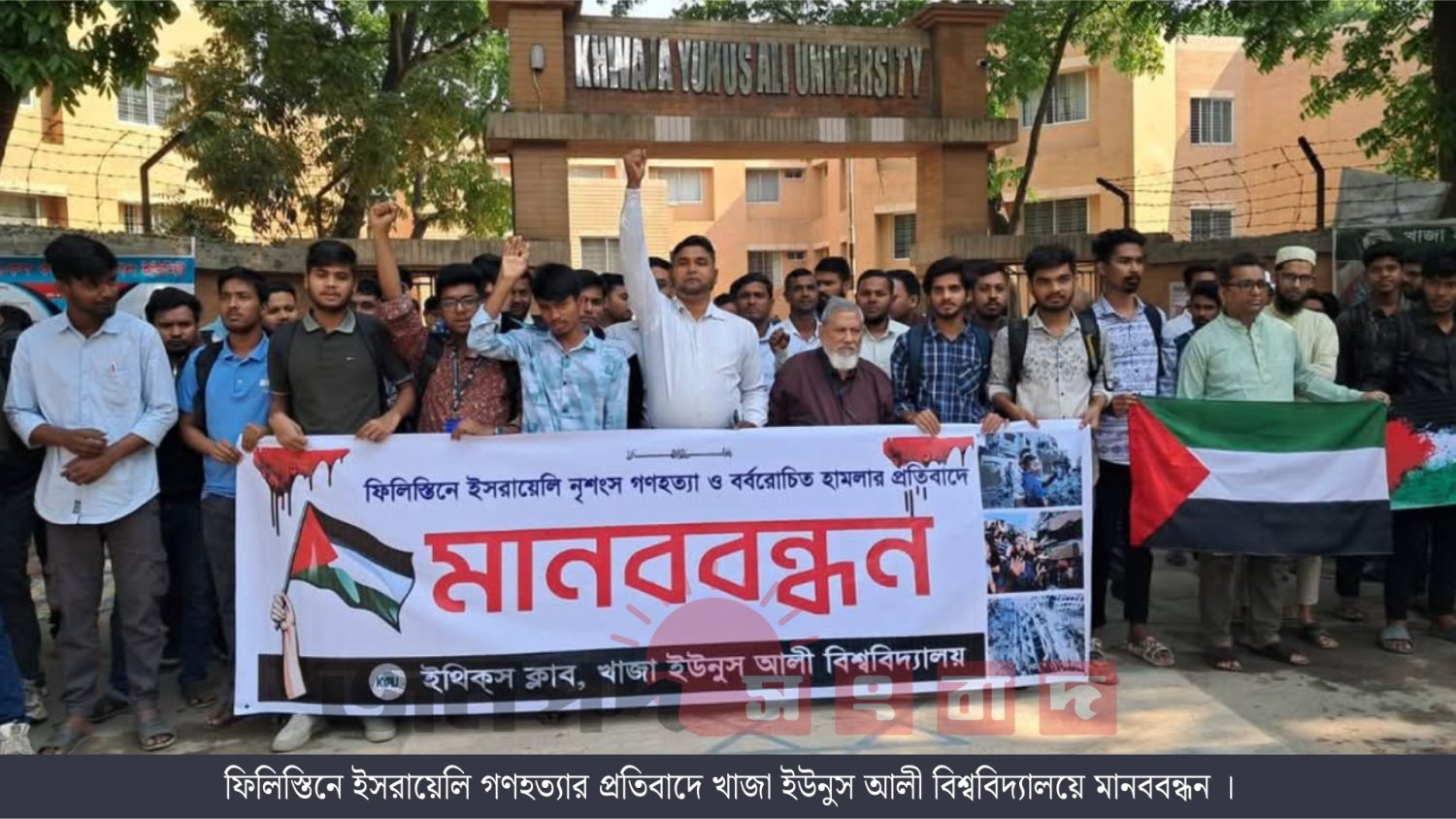 আব্দুল আওয়াল, এনায়েতপুর (সিরাজগঞ্জ): ফিলিস্তিনে ইসরায়েলি নৃশংস গণহত্যা ও বর্বরোচিত হামলার প্রতিবাদে খাজা ইউনুস আলী বিশ্ববিদ্যালয়ে মানববন্ধন অনুষ্ঠিত হয়েছে। খাজা