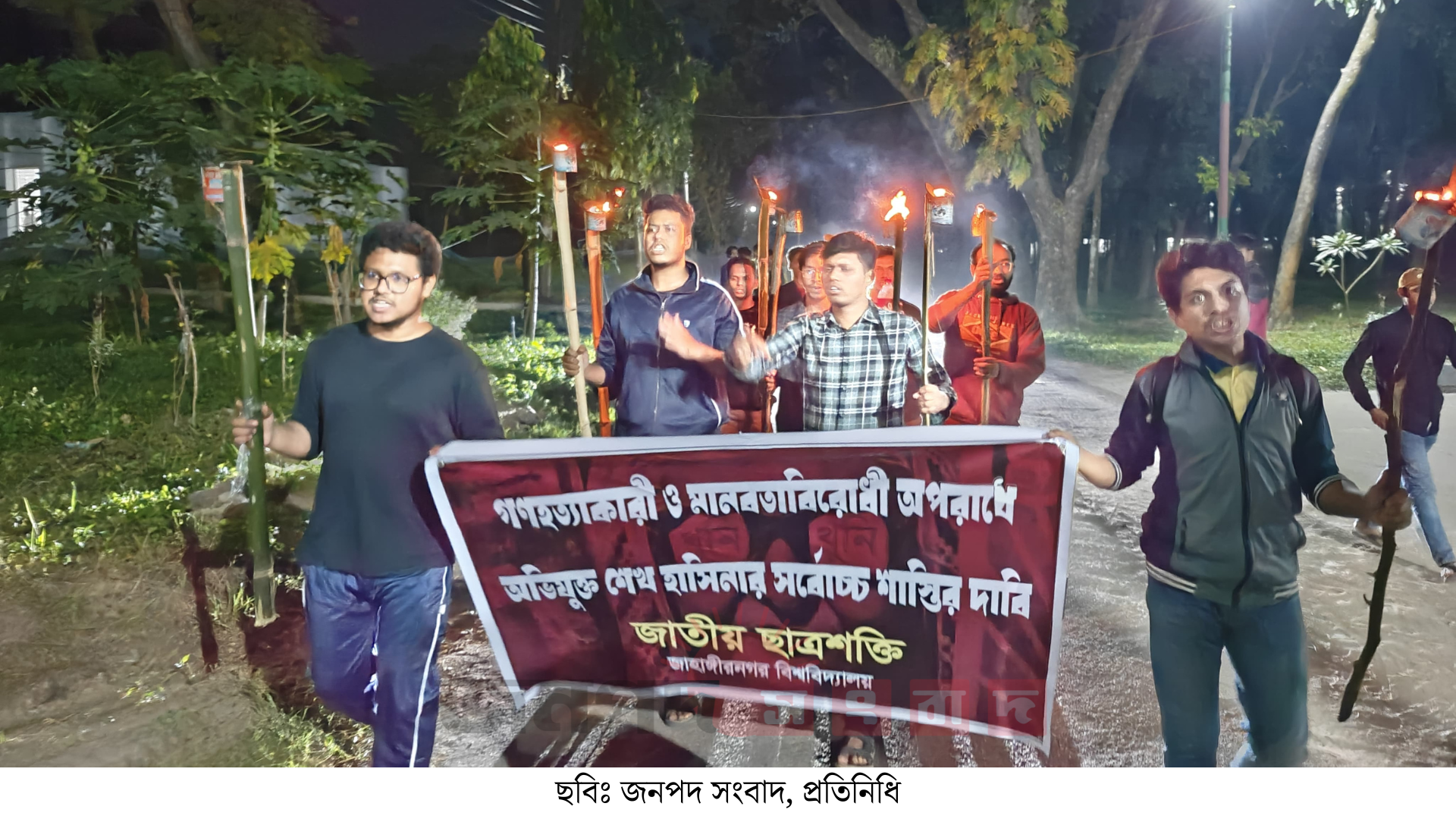 গণহত্যা ও মানবতাবিরোধী অপরাধের অভিযোগে অভিযুক্ত শেখ হাসিনার সর্বোচ্চ শাস্তির দাবি জানিয়ে মশাল মিছিল করেছে জাতীয় ছাত্রশক্তি, জাহাঙ্গীরনগর বিশ্ববিদ্যালয় শাখা।