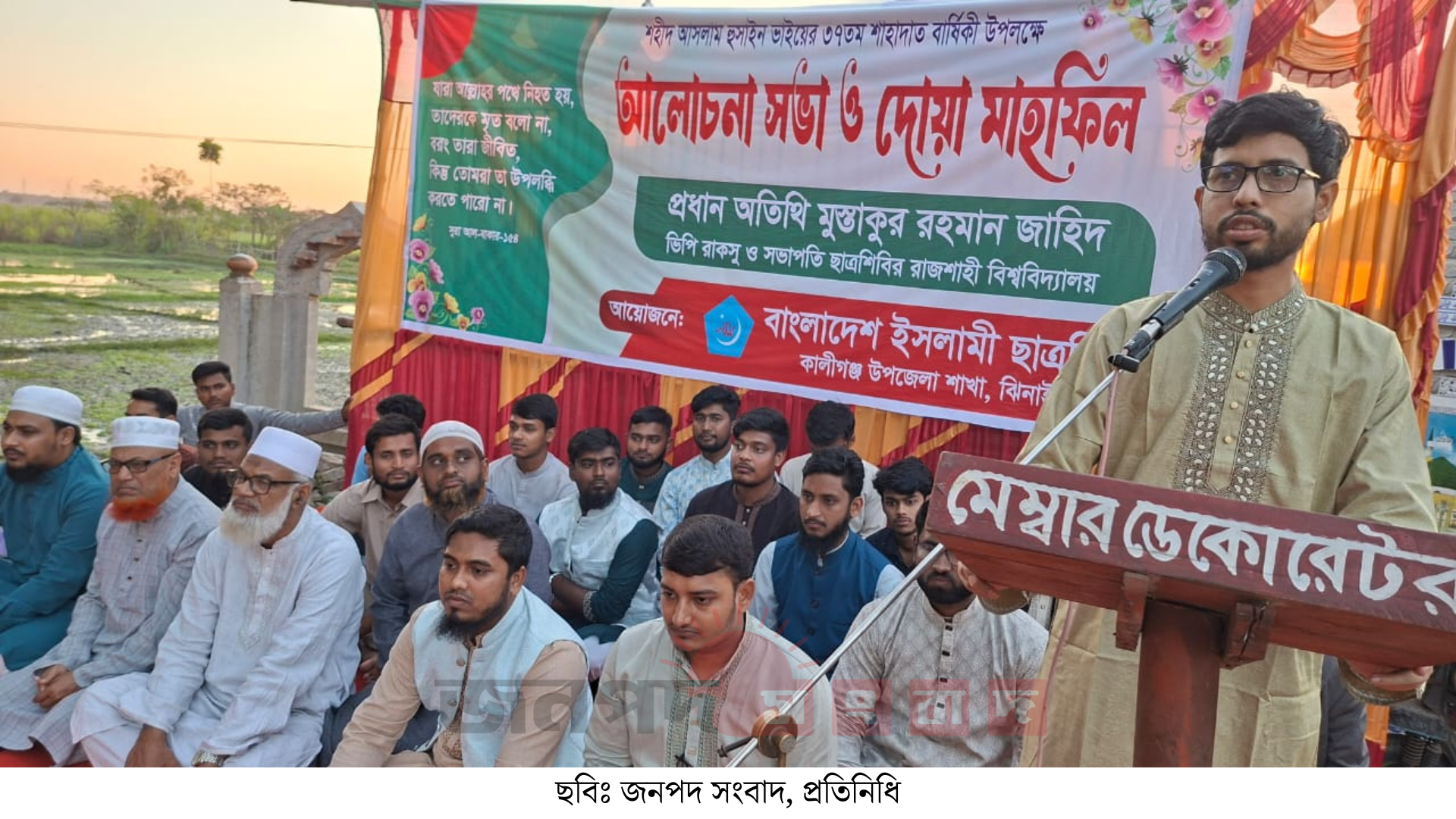 ঝিনাইদহের কালীগঞ্জে ইসলামী ছাত্রশিবিরের রাজশাহী বিশ্ববিদ্যালয়ের ছাত্র শহীদ আসলাম হোসেনের ৩৭তম শাহাদাত বার্ষিকী উপলক্ষে আলোচনা সভা ও দোয়া মাহফিল অনুষ্ঠিত হয়েছে।