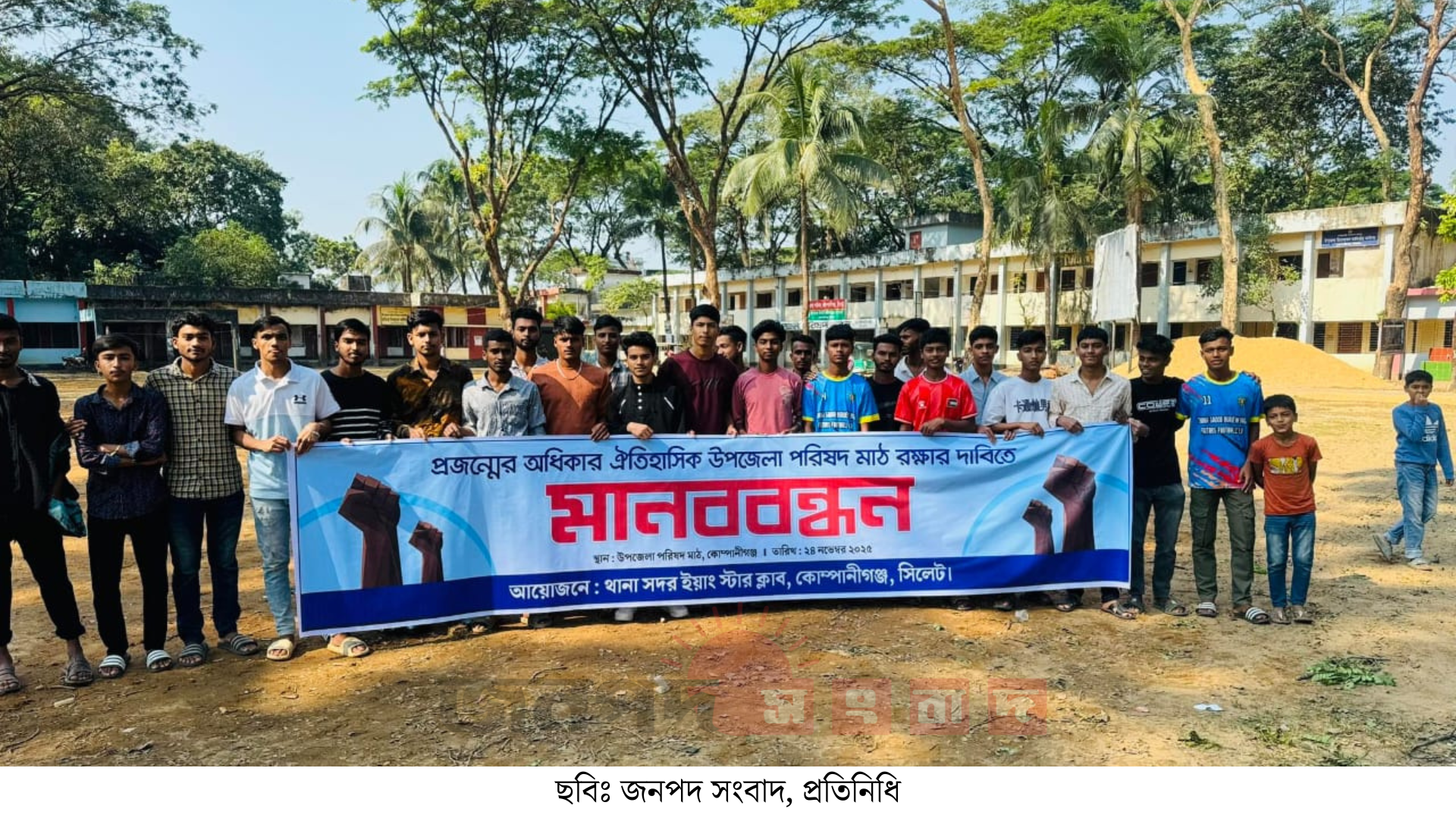 সিলেটের কোম্পানীগঞ্জ উপজেলা পরিষদ মাঠে ভবন নির্মাণ পরিকল্পনার প্রতিবাদে মানববন্ধন অনুষ্ঠিত হয়েছে।