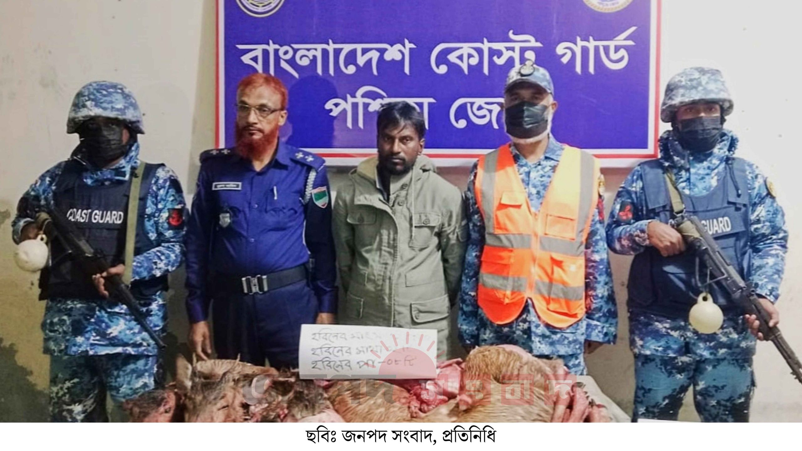 বাগেরহাটের মোংলায় কোস্টগার্ড ও পুলিশের যৌথ অভিযানে ৩২ কেজি হরিণের মাংস, মাথা, পা ও ফাঁদসহ ১ শিকারি আটক।