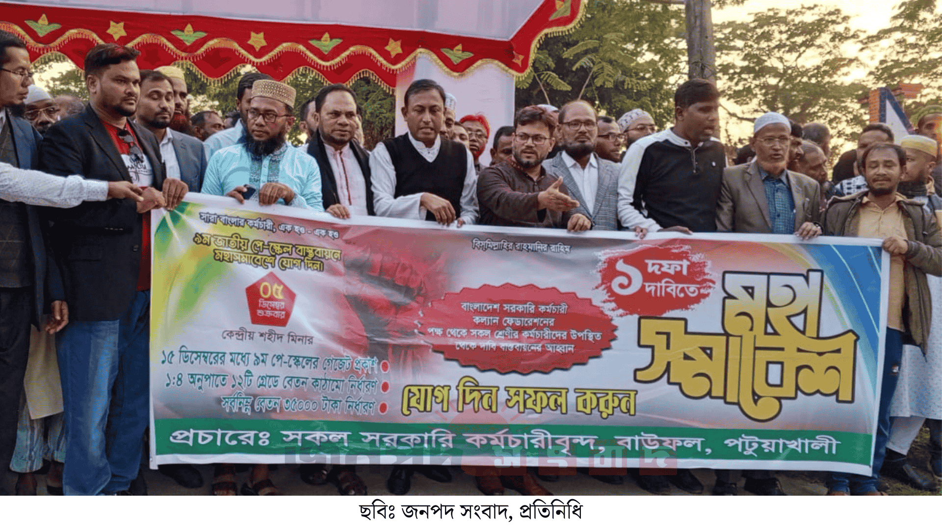 পটুয়াখালীর বাউফলে সরকারি কর্মচারীদের ন্যায্য দাবি—৯ম পে-স্কেল দ্রুত বাস্তবায়নের দাবিতে বিক্ষোভ সমাবেশ ও আলোচনা সভা অনুষ্ঠিত হয়েছে।