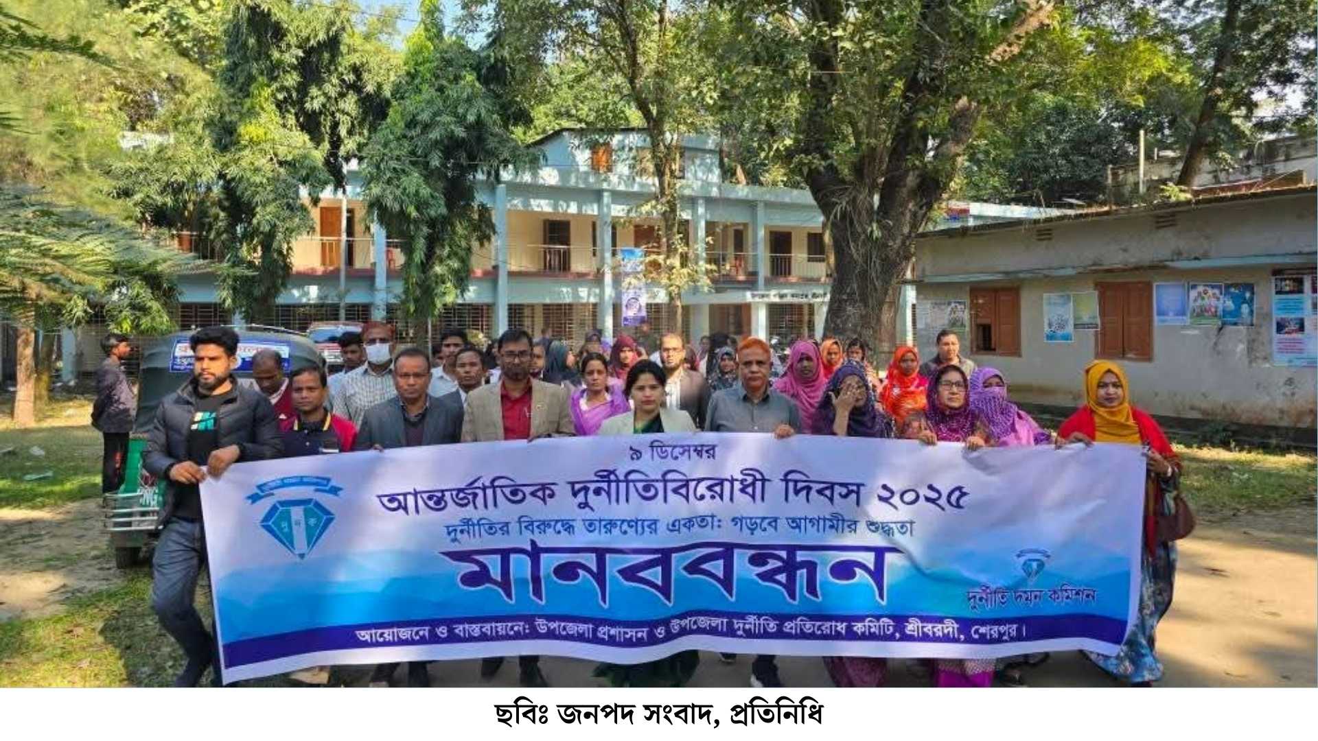 "দুর্নীতির বিরুদ্ধে তারুণ্যের একতা, গড়বে আগামীর শুদ্ধতা " এই প্রতিপাদ্য বিষয়কে সামনে রেখে শেরপুরের শ্রীবরদীতে আন্তর্জাতিক দুর্নীতি বিরোধী দিবস পালিত হয়েছে।