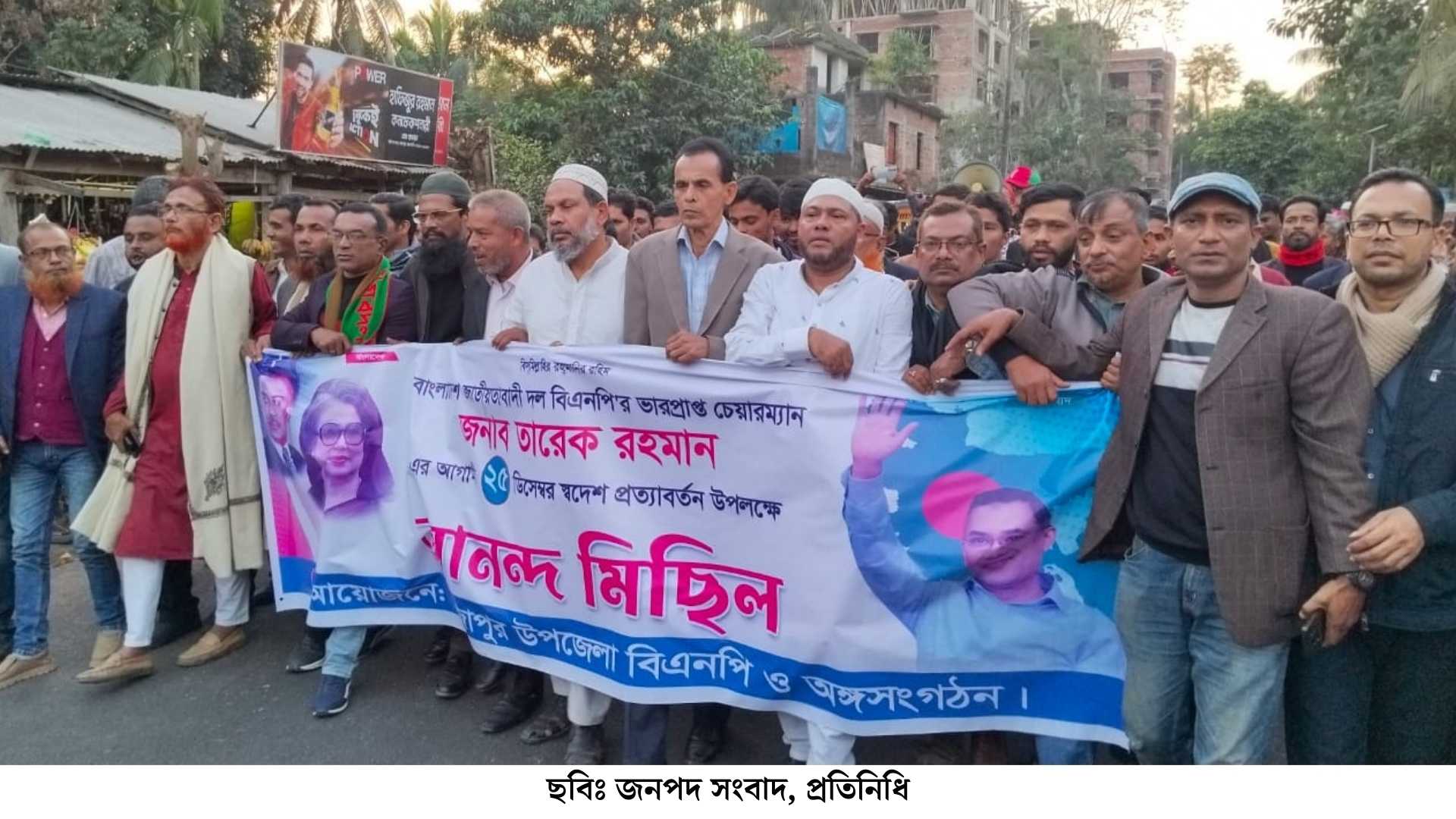 বিএনপির ভারপ্রাপ্ত চেয়ারম্যান তারেক রহমানের আগামী ২৫ ডিসেম্বর স্বদেশ প্রত্যাবর্তন উপলক্ষে ঝালকাঠির রাজাপুরে আনন্দ মিছিল করেছে উপজেলা বিএনপি ও অঙ্গসংগঠনগুলো।