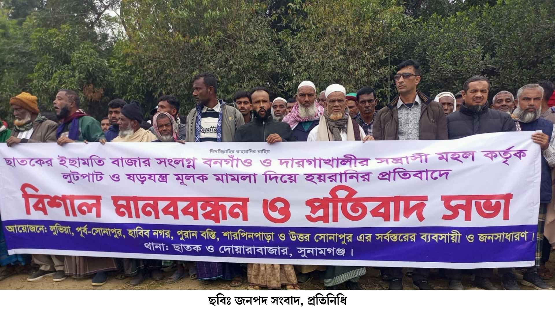 সোমবার (২৯ ডিসেম্বর) দুপুরে দোয়ারাবাজার উপজেলার নরসিংপুর ইউনিয়নের পূর্ব সোনাপুর গ্রামের খেলার মাঠে আয়োজিত প্রতিবাদ সভা শেষে এক বিশাল মানববন্ধন কর্মসূচি অনুষ্ঠিত হয়। এতে নরসিংপুর ইউনিয়নের হাবিব নগর, পূর্ব সোনাপুর, পুরান বস্তি, সারপিন পাড়া, উত্তর সোনাপুর এবং ছাতক উপজেলার লুভিয়া গ্রামের সহস্রাধিক নারী-পুরুষসহ সর্বস্তরের মানুষ অংশগ্রহণ করেন।।