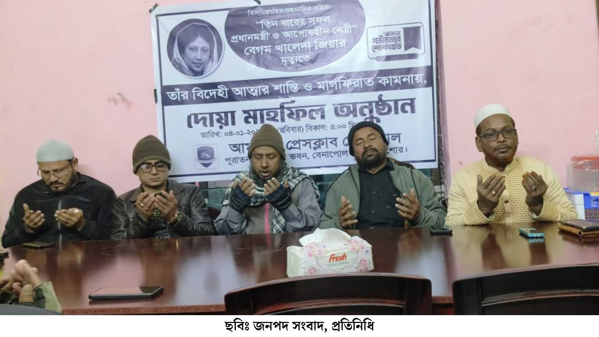 সাবেক প্রধানমন্ত্রী ও বিএনপি চেয়ারপারসন বেগম খালেদা জিয়ার মৃত্যুতে গভীর শোক প্রকাশ করে তার বিদেহী আত্মার মাগফিরাত কামনায় দোয়া মাহফিলের আয়োজন করেছে “আমাদের প্রেসক্লাব বেনাপোল।