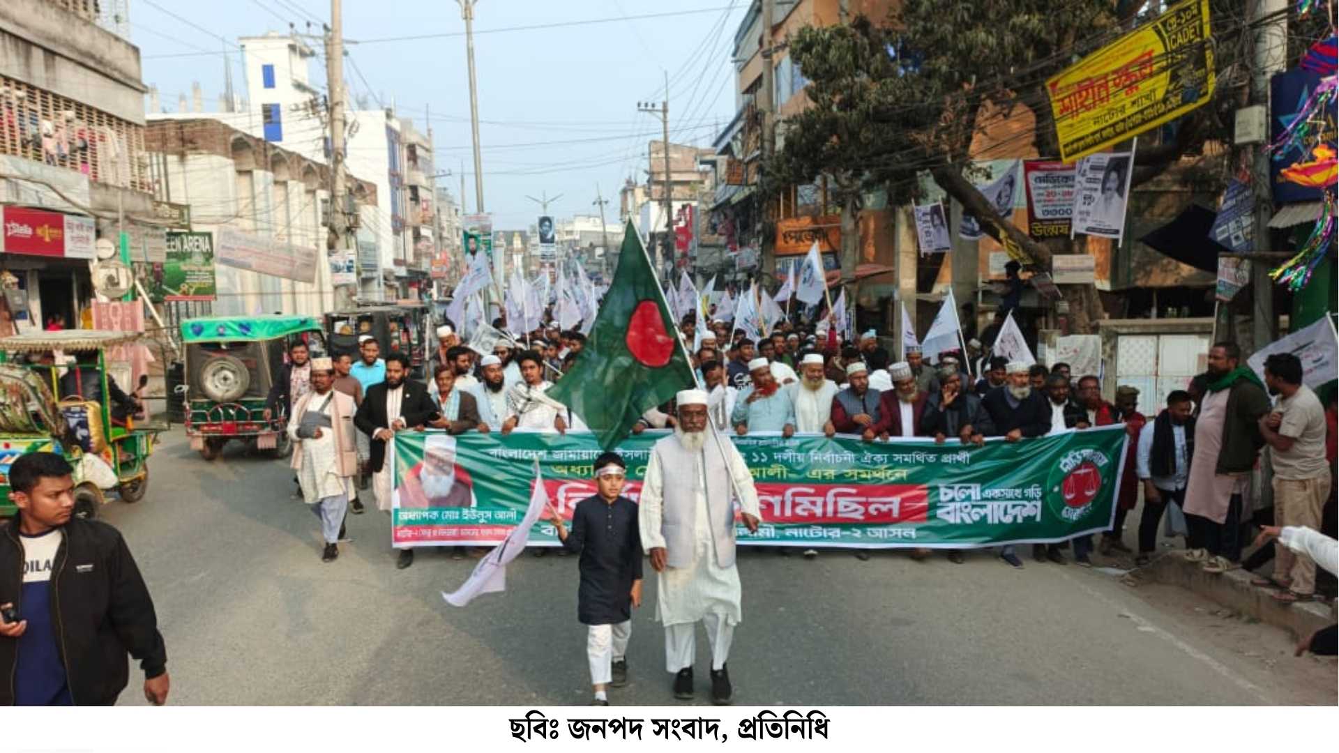 নাটোর-২ আসনে বাংলাদেশ জামায়াত ইসলামী’র উদ্যোগে সমাপ্তি নির্বাচনী গণমিছিল অনুষ্ঠিত হয়েছে। নির্ধারিত কর্মসূচির অংশ হিসেবে আয়োজিত এ গণমিছিলে দলের নাটোর-২ আসনের মনোনীত এমপি পদপ্রার্থী অধ্যাপক মোঃ ইউনুছ আলী স্থানীয় নেতাকর্মী, সমর্থক ও বিভিন্ন শ্রেণি-পেশার মানুষ অংশগ্রহণ করেন।