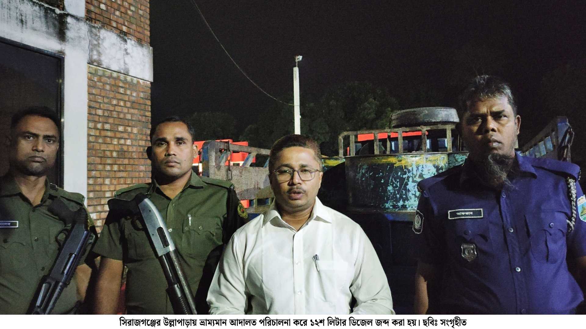 সিরাজগঞ্জ জেলার উল্লাপাড়ায় ভ্রাম্যমান আদালতের অভিযানে ১২শ’ লিটার ডিজেল জব্দ করা হয়েছে। আদালত এই সময় মজুতকারী ডিজেলের মালিক শাহ জামালকে ১০ হাজার টাকা জরিমানা অনাদায়ে ১৫ দিনের বিনাশ্রম কারাদণ্ড প্রদান করেন।