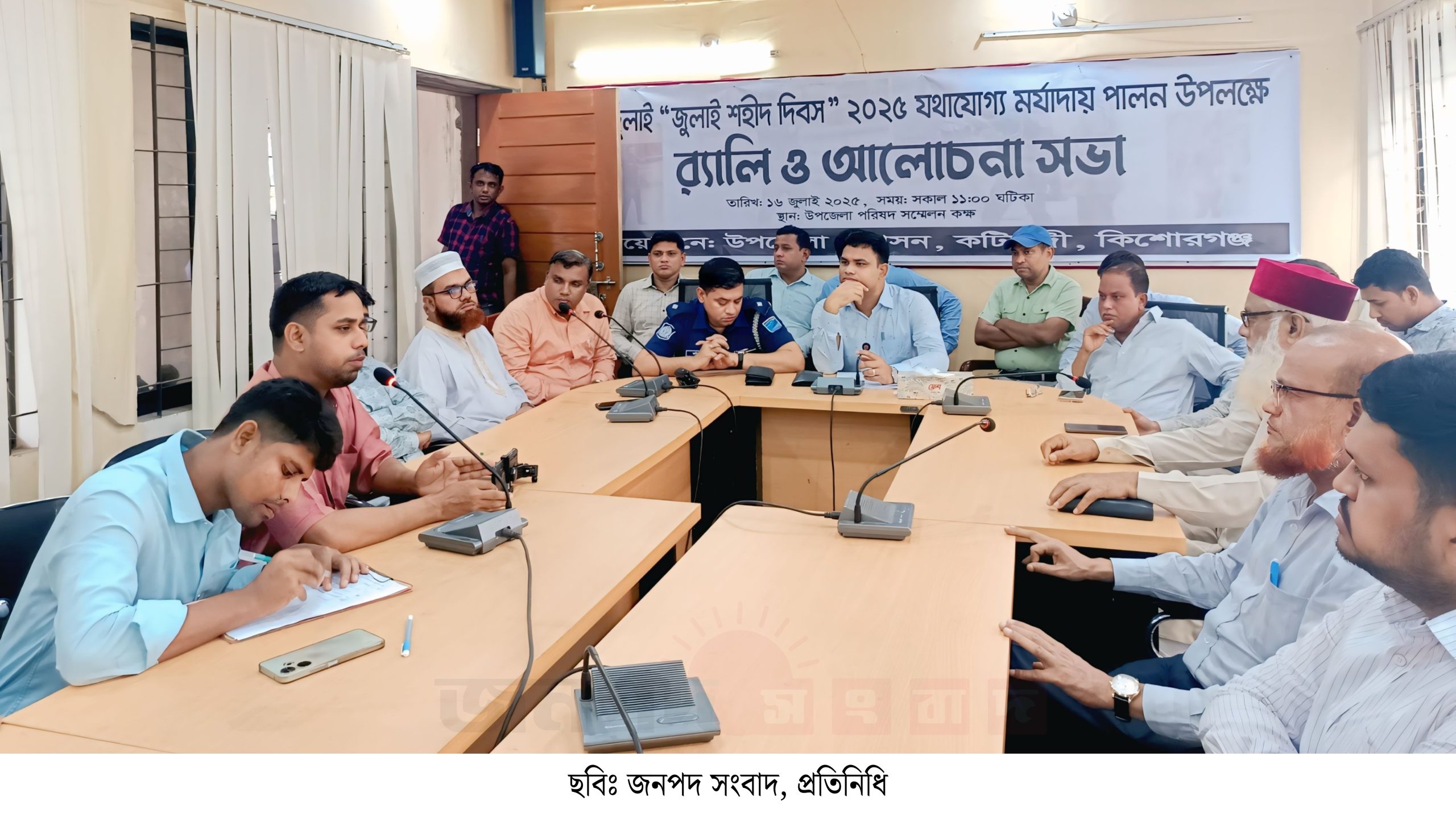 'জুলাই শহীদ দিবস' উপলক্ষে কিশোরগঞ্জের কটিয়াদীতে উপজেলা প্রশাসনের আয়োজনে এক আলোচনা সভা ও দোয়া অনুষ্ঠানের আয়োজন করা হয়। এ উপলক্ষে উপজেলা চত্বর থেকে একটি রযালি বের হয়ে বাজারের প্রধান প্রধান সড়ক প্রদক্ষিণ করে একই স্থানে এসে শেষ হয়।