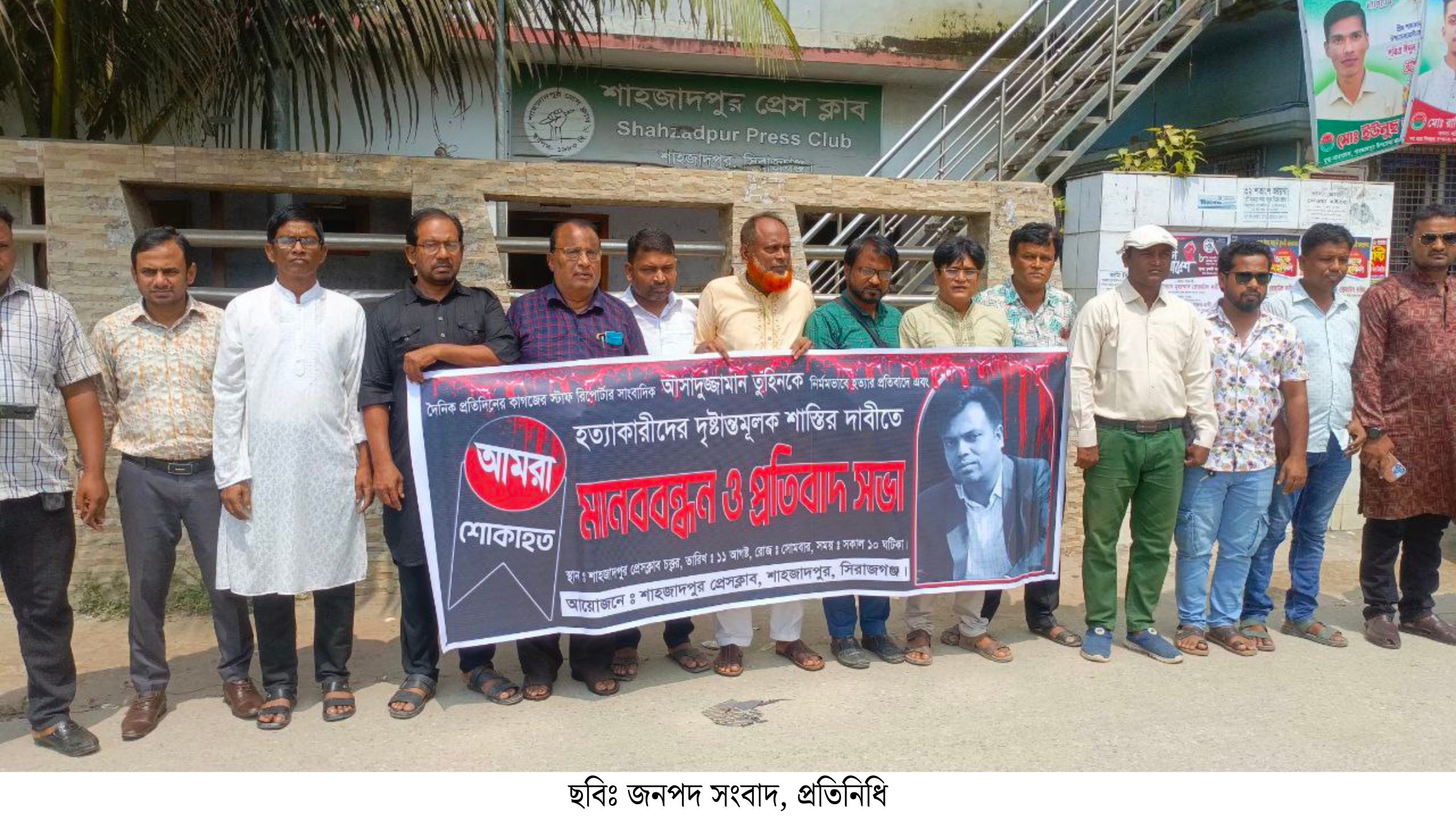 সিরাজগঞ্জের শাহজাদপুর প্রেসক্লাবের উদ্যোগে সাংবাদিক তুহিন হত্যার দ্রুত বিচার দাবিতে মানববন্ধন অনুষ্ঠিত হয়েছে।