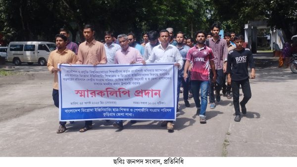 প্রকৌশল ও প্রযুক্তি বিশ্ববিদ্যালয়ের শিক্ষার্থীগন কর্তৃক প্রকৌশলী অধিকার আন্দোলন এর ব্যানারে ডিপ্লোমা ইঞ্জিনিয়ারিং শিক্ষাক্রম ও ডিপ্লোমা ইঞ্জিনিয়ারদের বিরুদ্ধে অব্যাহত ষড়যন্ত্রের প্রতিবাদে কেন্দ্রীয় সংগ্রাম পরিষদ ঘোষিত কর্মসূচি অনুযায়ী কুড়িগ্রামে জেলা প্রশাসকের মাধ্যমে প্রধান উপদেষ্টা বরাবর স্মারক লিপি প্রদান করা হয়েছে।