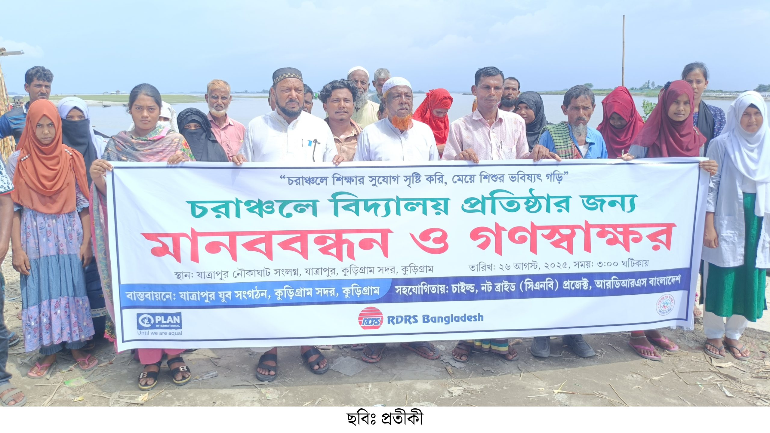 “চরাঞ্চলে শিক্ষার সুযোগ সৃষ্টি করি, মেয়ে শিশুর ভবিষ্যৎ গড়ি” এই শ্লোগানে কুড়িগ্রামের চরাঞ্চলে বিদ্যালয় প্রতিষ্ঠার দাবিতে মানববন্ধন ও গণস্বাক্ষর অনুষ্ঠিত হয়েছে।
