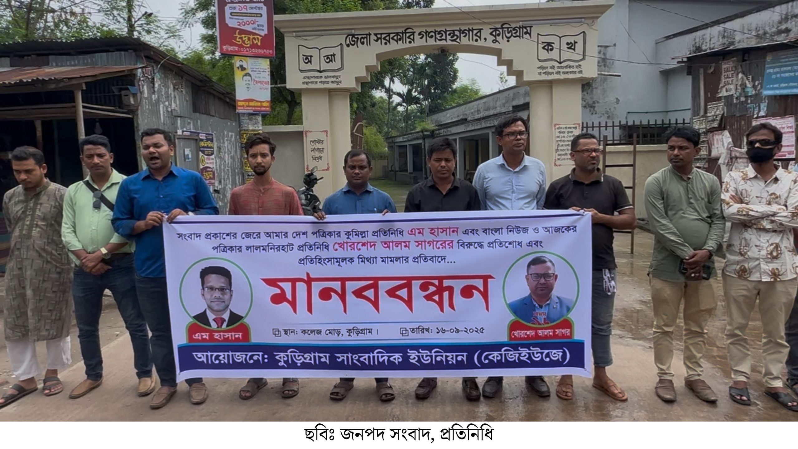 কুমিল্লার আমার দেশ পত্রিকার জেলা প্রতিনিধি এম. হাসান ও লালমনিরহাটের আজকের পত্রিকার জেলা প্রতিনিধি খোরশেদ আলম সাগরের নামে মিথ্যা ও হয়রানিমূলক মামলা প্রত্যাহারের দাবিতে মানববন্ধন করেছে কুড়িগ্রাম সাংবাদিক ইউনিয়ন (কেজিইউজে)।