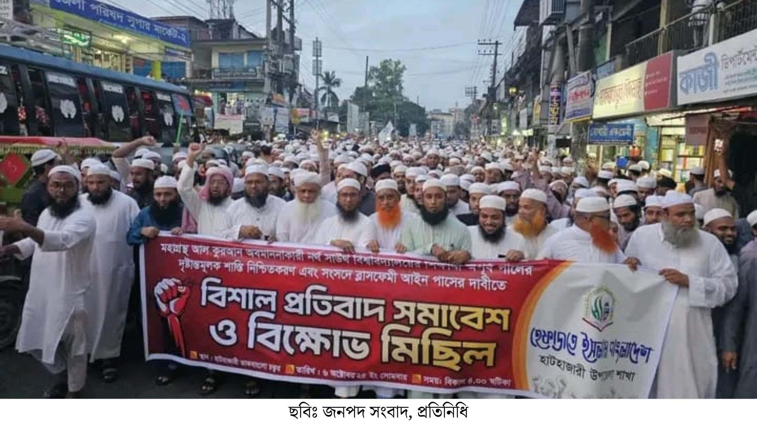 প্রতিবাদ সমাবেশ শেষে হাজারো আলেম-ওলামা ও তৌহিদী জনতার অংশগ্রহণে হাটহাজারী ডাক বাংলো চত্বর থেকে বিশাল বিক্ষোভ মিছিল শুরু হয়ে চট্টগ্রাম খাগড়াছড়ি সড়ক,হাটহাজারী বাসস্ট্যান্ড ও চট্টগ্রাম রাঙ্গামাটি সড়ক প্রদক্ষিণ করে হাটহাজারী মাদরাসার সামনে শেষ হয়।