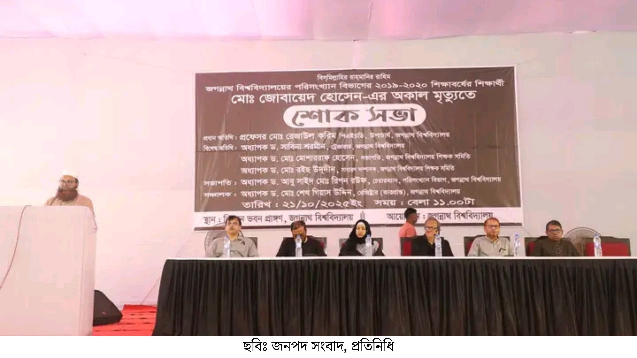 জগন্নাথ বিশ্ববিদ্যালয়ের (জবি) পরিসংখ্যান বিভাগের ২০১৯–২০ শিক্ষাবর্ষের (১৫তম ব্যাচ) শিক্ষার্থী এবং বিশ্ববিদ্যালয় শাখা ছাত্রদলের আহ্বায়ক সদস্য মো. জুবায়েদ হোসেন নির্মম হত্যাকাণ্ডের ঘটনায় গভীর শোক প্রকাশ করে শোকসভার আয়োজন করেছে বিশ্ববিদ্যালয় পরিবার।