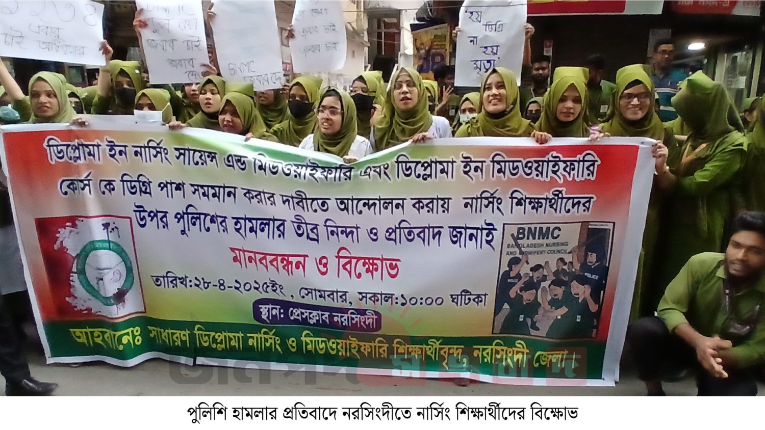 নরসিংদী প্রতিনিধি: ডিপ্লোমাকে ডিগ্রি’র সমমান করার দাবি আদায়ের বিক্ষোভ সমাবেশে ঢাকায় বিএনএমসি ভবনে শিক্ষার্থীদের ওপর পুলিশি হামলার প্রতিবাদে নরসিংদীতে বিক্ষোভ